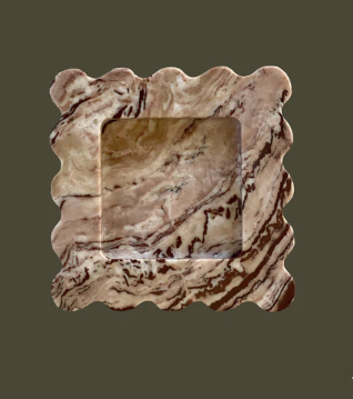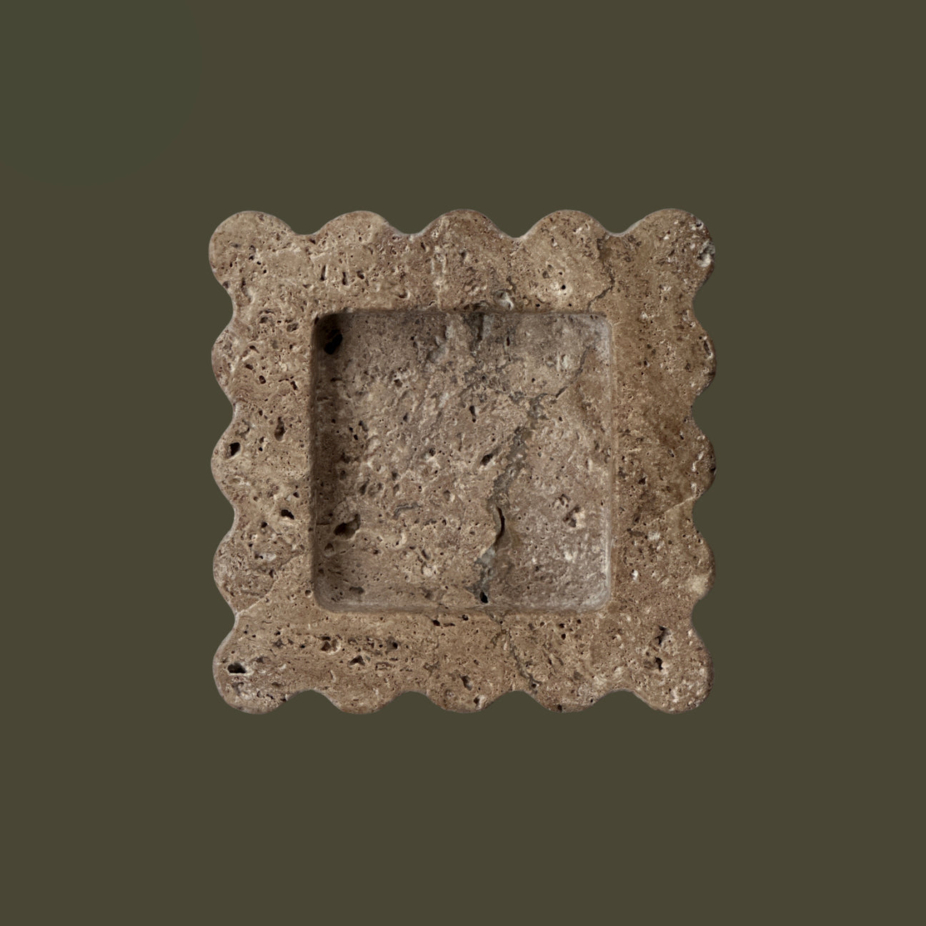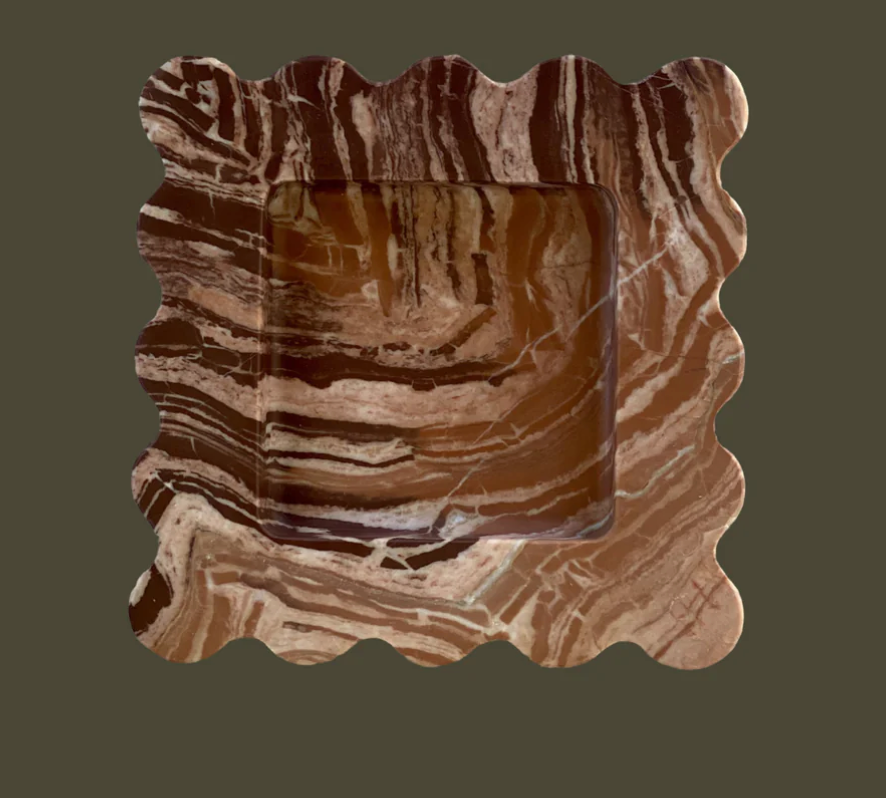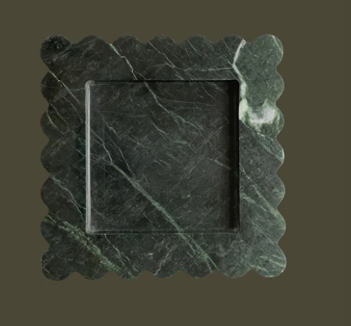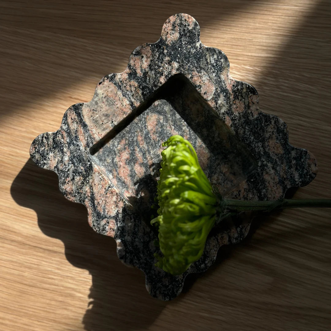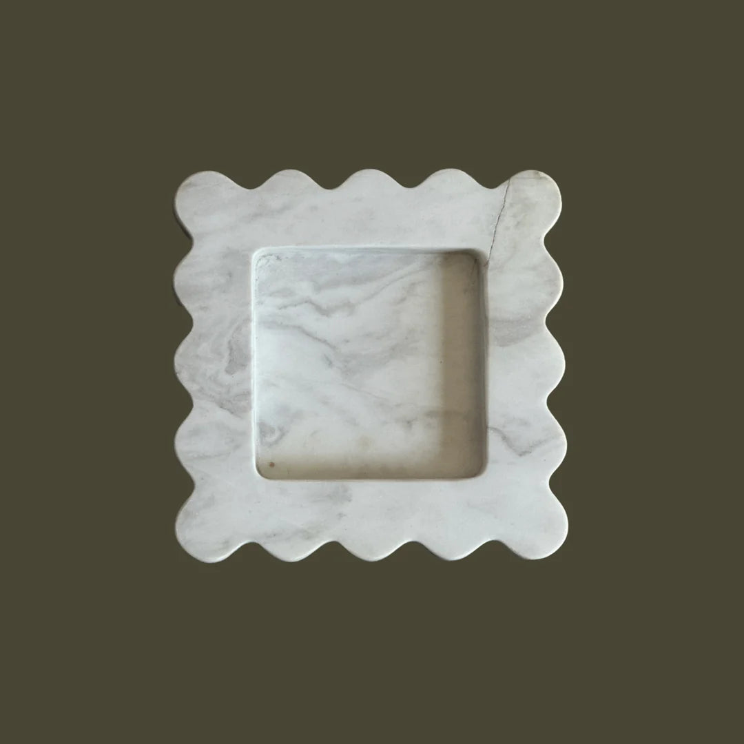 The Mini Box is a sculptural five by five inch square catchall cut from a single piece of solid marble or stone with scalloped edges, hand-finished by artisans in a growing stone atelier in Rajasthan, India.