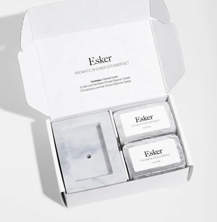 Our Aromatic Shower Steamer Set brings an aromatherapy experience into your daily rinse. Our all-natural shower steamer tablets are vapor and water activated, releasing refreshing essential oils and minerals into the stream. Unlike other shower steamers which are meant to be tossed on the floor to create a slippery mess, our hand-carved carrara marble holder houses the tablets in an elegant and functional base. The set comes with two scents, a grounding Calendula Palo Santo and uplifting Eucalyptus Lavender, each handcrafted with dried botanicals.