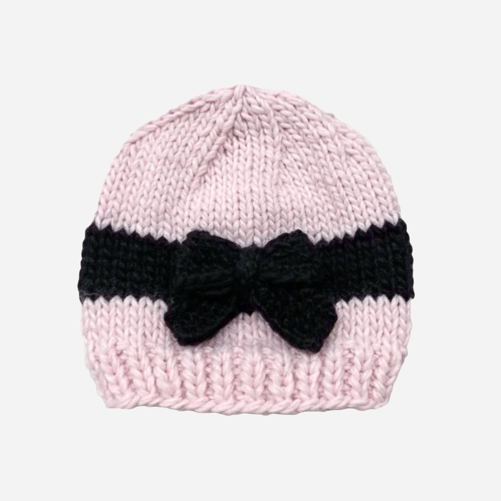 Featuring a Black Bow on a Baby Pink Hat. Match with our Bow Cardigan and Mittens