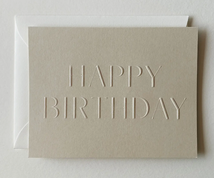 * A2 Folded 4.25" L × 5.5" W * "Happy Birthday" * Available in Sand or Brown Cover Stock * Blind Emboss * Natural Envelope * Blank interior * Made in Santa Barbara