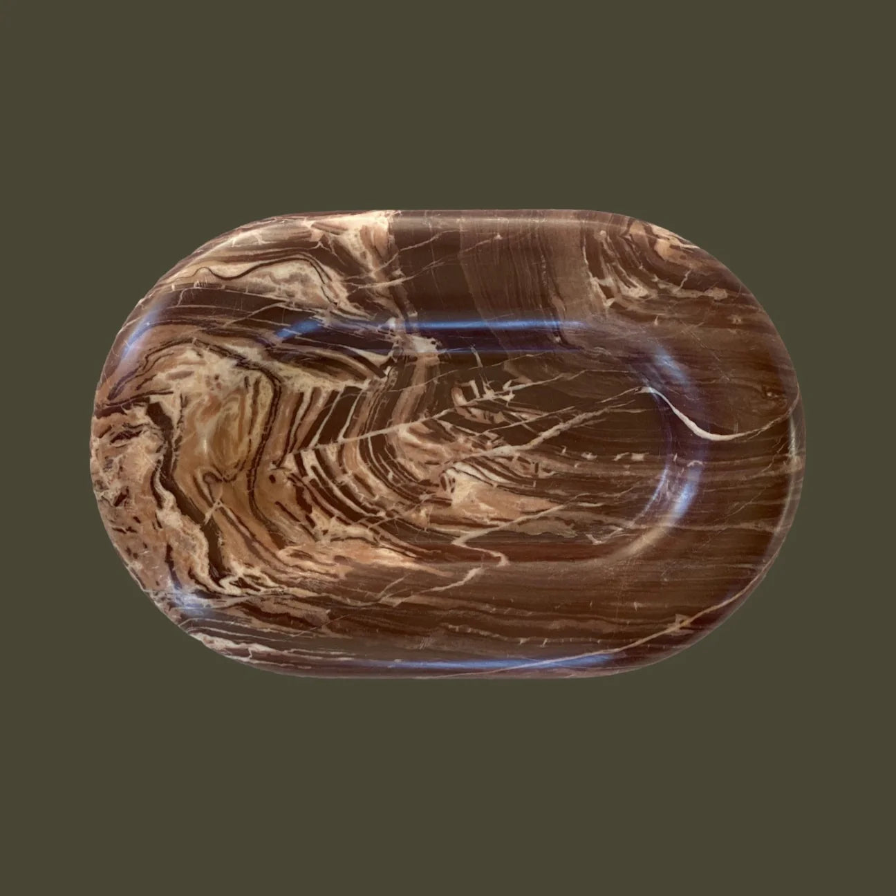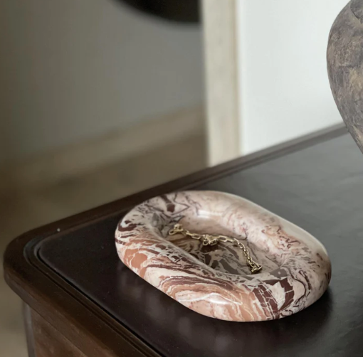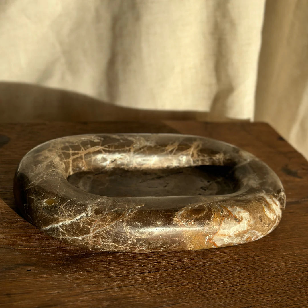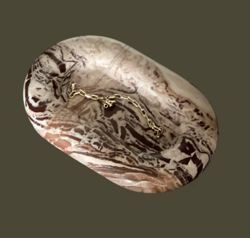 The Maddi is a chunky, six-inch oval catchall cut from a single piece of solid marble or stone with a large, playfully modern “puffed” border, hand-finished by artisans in a growing stone atelier in Rajasthan, India.