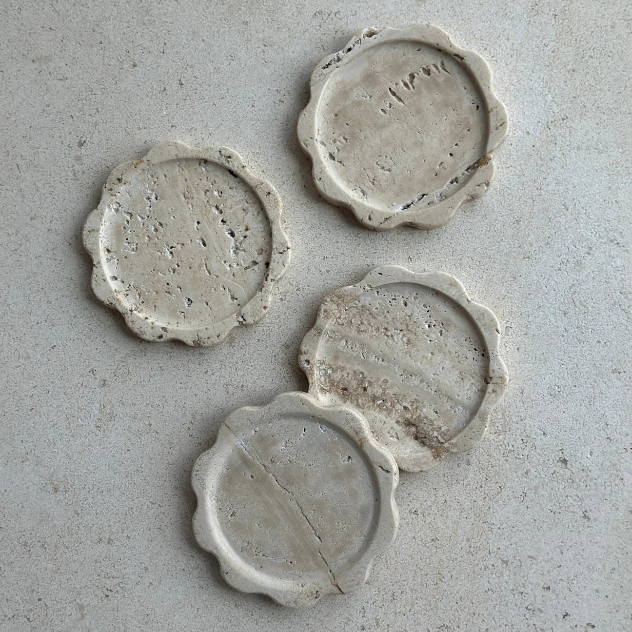 The Coasters are a set of 4 three inch scalloped beverage coasters cut from a single piece of solid marble, hand-finished by artisans in a growing stone atelier in Rajasthan, India.