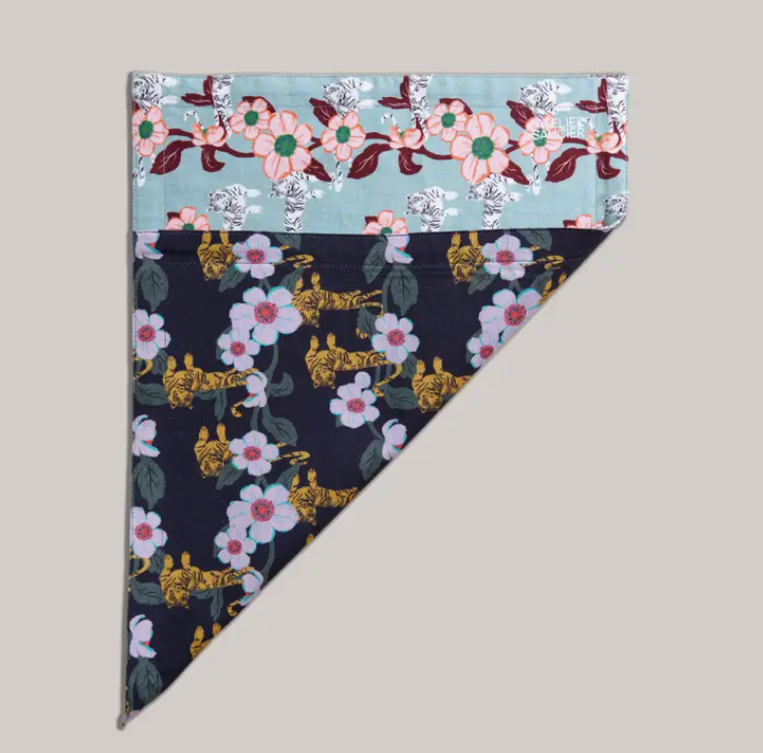 Fall / holiday 2022 collection For a touch of dramatic flair this season, we collaborated with she she, a multidisciplinary design studio focusing on wallpaper, textiles and home furnishings. The result is four exclusive prints to surprise and delight your guests. Our best-selling signature twill textile creates the base for this velvety reversible placemat. One side features lounging golden tigers and vibrant florals set against a midnight blue backdrop; while the other introduces white tigers atop a cool teal canvas. This patterned placemat will turn your dining experience into an exotic jungle party! Made in los angeles 100% premium reclaimed fabric Size: 17” x 13” Wash cold, hang dry, press with low iron while damp